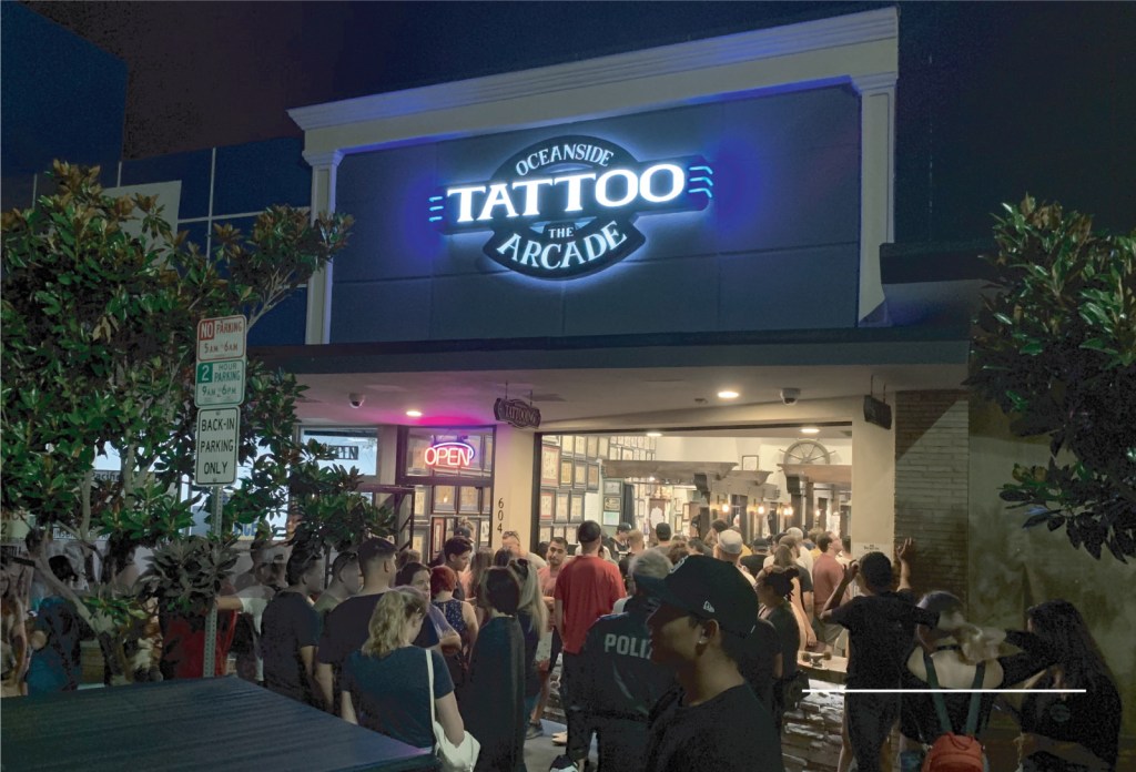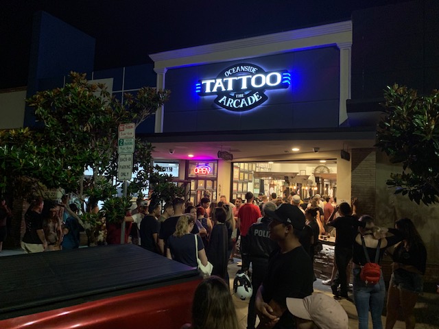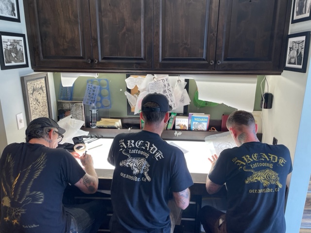 THE ARCADE” located at 604 mission av. Oceanside California. “The Arcade” Namesake is a tribute to the “FIRST” and Original Tattoo shop in Oceanside, Ca. The original arcade was open from 1938-1982. During these 44 years the Arcade saw action from WW2, Korea, and Vietnam. Many Famous, but now deceased Tattoo Artists passed through the Arcade during these war years to cut their teeth on the thousands of marines wanting to get their first tattoos before being sent off to fight in a foreign land.. Camp Pendleton is the Largest military base in the U.S. located at the North end of Oceanside California. William “Buzz” Claydon, the infamous “spike”, and “Tahiti” Maurice Lynch were the resident artists who manned the helm of the arcade during these Golden years of tattooing in Oceanside Ca.